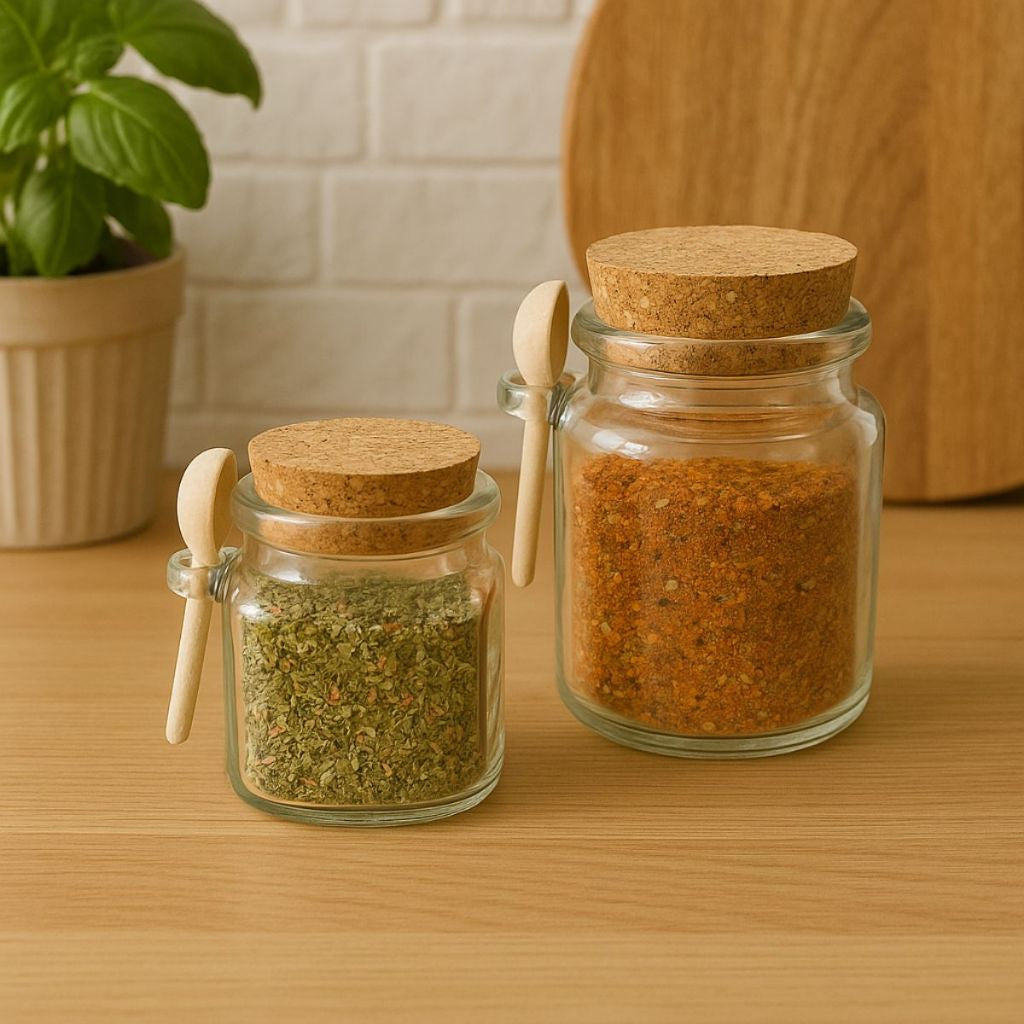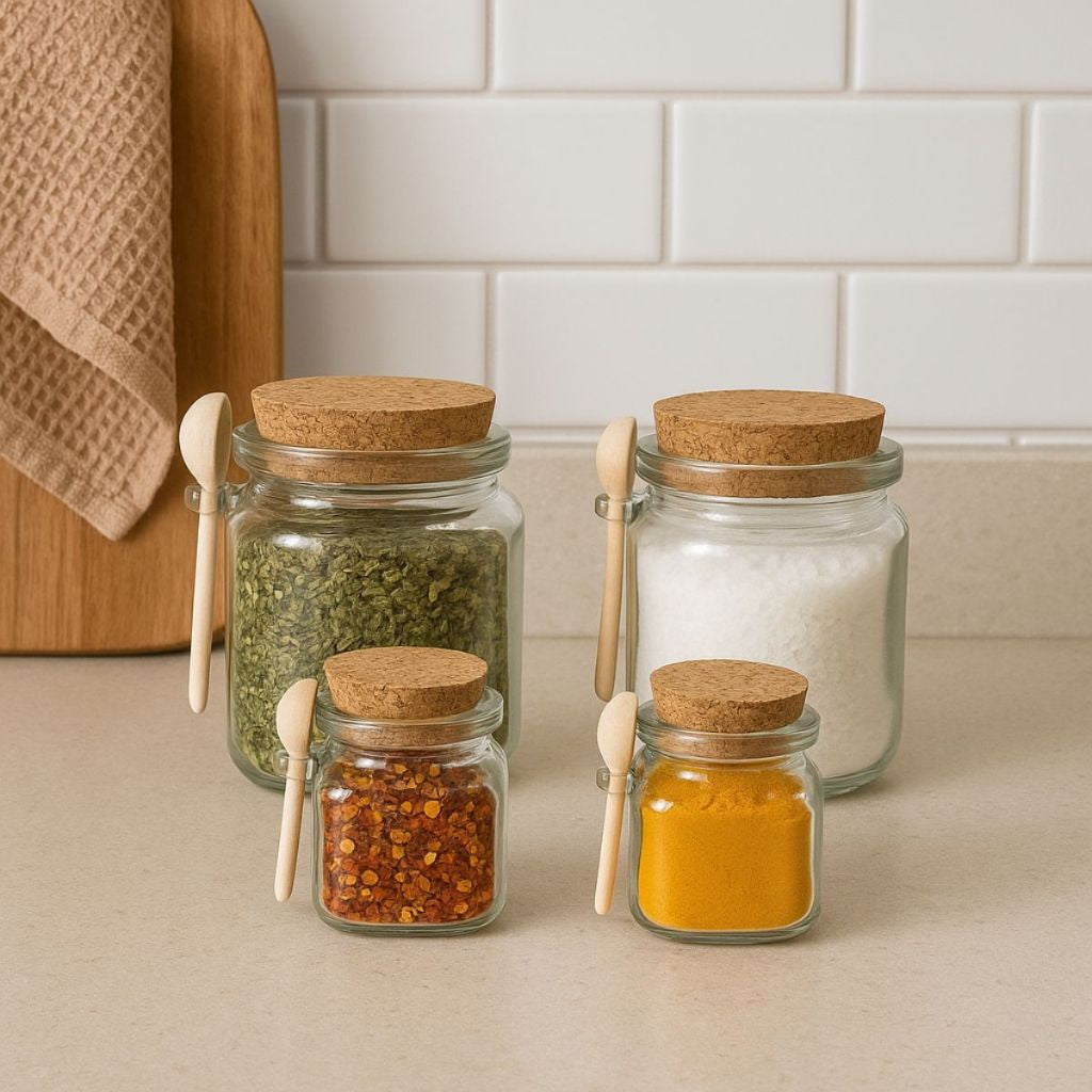 Kit Potes de Vidro com Tampa de Rolha e Colher de Bambu – Charme Natural para Temperos e Condimentos