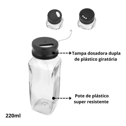 ✅ 12 potes individuais (220ml) com tampas giratórias dosadoras